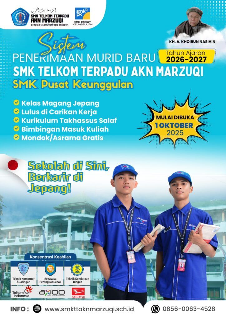 SMK Telkom Terpadu AKN Marzuqi kembali membuka Penerimaan Peserta Didik Baru (SPMB) Gelombang 1 untuk Tahun Ajaran 2026/2027. Pendaftaran dimulai pada 1 Oktober 2025, terbuka bagi lulusan SMP/MTs sederajat yang ingin melanjutkan pendidikan ke jenjang menengah kejuruan dengan bekal ilmu agama dan keterampilan teknologi berbasis industri.