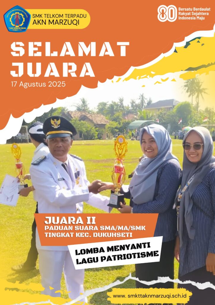 Dengan diraihnya Juara II dalam lomba paduan suara, SMK Telkom Terpadu AKN Marzuqi semakin menunjukkan komitmennya untuk mencetak generasi muda yang berkarakter, berprestasi, serta memiliki jiwa nasionalisme kuat.